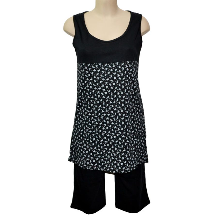 Rachel Πυτζάμα Γυναικεία Βερμούδα σε Μαύρο χρώμα. Πυτζάμα βερμούδα, με αμάνικη μπλούζα. Η μπλούζα σε Μαύρο jersey, με τυπωτό μοτίβο λουλουδάκια. Το παντελόνι είναι βερμούδα σε χρώμα μαύρο.
